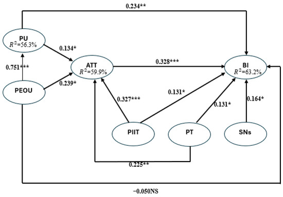 Regarding the direct influence on behavioral intention (BI), the results show that attitudes have the highest influence (ATT → BI: β = 0.328 ***). Perceived usefulness also has a significant influence on BI (PU→BI: β = 0.234 **). Subjective norms also exert a significant influence on BI (SNs → BI: β = 0.164 *), followed by perceived trust and personal innovativeness, which have significant influences on BI, albeit to a lesser extent (PT → BI: β = 0.131 *; PIIT → BI: β = 0.131 *). Notably, perceived ease of use (PEOU) does not significantly influence BI, hence H6 was not supported.