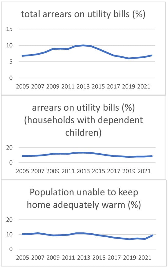 Total arrears on utility bills, arrears on utility bills in households with dependent children, population unable to keep home adequately warm (%) in the EU-27 (2005–2023). Source: Author’s graph based on EU-SILC survey data.