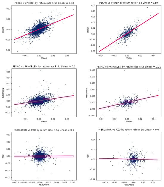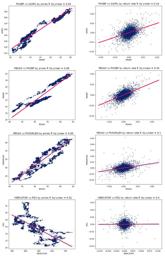 The regression line and the value of the coefficient of determination for the following pairs (starting from the top): [PKO BP and Santander], [Bank PEKAO and PKO BP], [Bank PEKAO and PKN Orlen], and [Mercatorn Medical and PZU]. Two charts were prepared based on stock prices and rates of return. Data of the type intraday with an interval of 5 min for the period from 1 August 2020 to 31 December 2020.