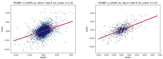 It should be noted that the charts in question are based on data obtained for the 5 min interval. For small intervals, the percentage price changes are close to zero. In the short term, it is difficult to observe large “price jumps”. Comparing the results for individual pairs of companies in Table 3, one can conclude that the interval up of to 60 mins does not affect the value of correlation. A completely different situation is in the case of correlations based on percentage price changes in Table 4. In this case, the length of the interval has a strong influence on the value of the correlation. The following relationship can be observed: the longer the observation interval, the stronger the correlation. Of course, there are minor deviations from this rule, but you can see a strong effect of the length of the interval on the strength of the correlation. For comparison, scatter plots for a 60-min interval are shown in Figure 2.