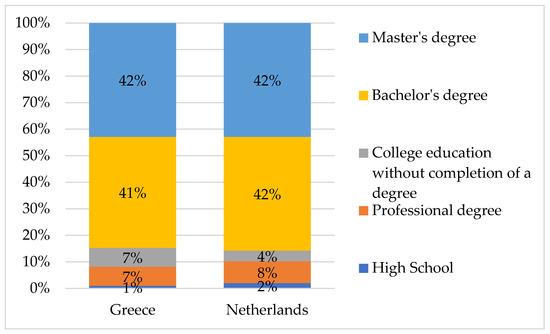 Figure 3 offers a comparative analysis of the educational levels between Greece and the Netherlands, displaying the distributions as percentages of the total educational attainment in each country.