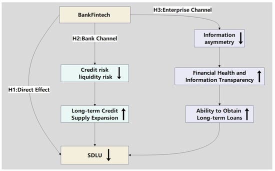 Currently, a multidimensional research paradigm has been established regarding the impact of Fintech on credit allocation and enterprise development. Scholars generally confirm that Fintech can significantly enhance the credit accessibility of small and micro-enterprises by improving information-screening capabilities and optimizing soft information processing, among other methods (; ; ). Furthermore, Fintech intensifies competition in the banking sector, thereby mitigating mismatches in investment and financing maturities (). The Pecking Order Theory of Finance () and the Credit Cycle Theory () also provide explanations for how Fintech, by alleviating information asymmetry, reconstructs the operational logic of the credit market and corporate financing behavior. The Credit Cycle Theory indicates that traditional banks, due to the “information island” effect, are prone to pro-cyclical credit expansion, whereas Fintech’s real-time data monitoring can reduce the amplitude of credit cycle fluctuations (). From the perspective of the Pecking Order Theory, Fintech promotes a shift in corporate financing order from “internal funds → short-term debt → long-term debt” to “credit loans → long-term financing” by mitigating information asymmetry (; ). Similar transmission mechanisms are observed in developed markets (e.g., LendingClub’s AI risk control model in the United States, open banking data sharing under the EU’s PSD2 framework) and emerging economies (e.g., India’s UPI system for real-time credit reporting, Brazil’s digital bank Nubank using behavioral data modeling), demonstrating common characteristics that affirm Fintech as not merely a technological tool but also an institutional force reshaping credit decision-making logic.
