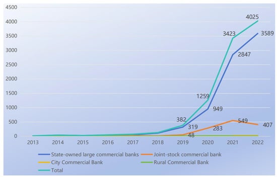 - Overall Trend: From 2013 to 2017, the number of financial technology patents in China’s commercial banks remained at a low level. However, a rapid growth trend emerged post-2018, culminating in a total of 4025 patents by 2022. This reflects a significant improvement in the banking sector’s innovation investment in the financial technology domain over time.