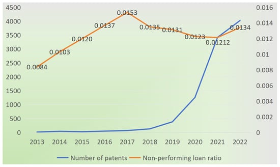The two broken lines in Figure 3 represent the trends of the total number of financial technology patents issued by sample banks in China from 2013 to 2022 and the non-performing loans, respectively. The following information can be analyzed from the trend in the figure: