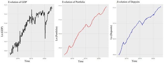 This section presents the results of the estimations. First, in order to see the behavior of the variables of interest over time, the series of the logarithm of GDP, the logarithm of total loans or bank portfolio, and the logarithm of total bank deposits are plotted, as shown in Figure 1.