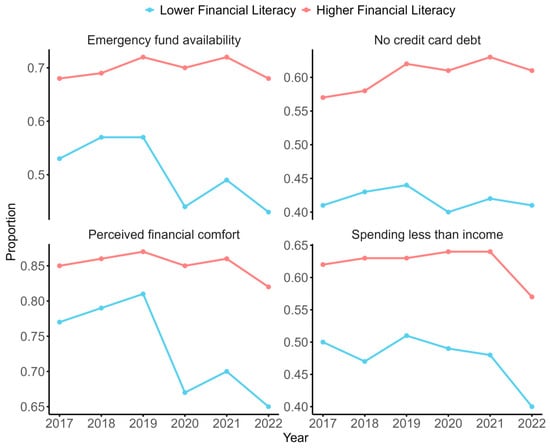 Figure 1 shows the yearly trends in the four FWB indicators for the respondents with higher and lower financial literacy. Similar to the existing literature, the findings show that respondents with higher financial literacy were substantially more likely to have emergency funds, spend less than income, have no credit card debt, and perceive financial comfort in all the years.