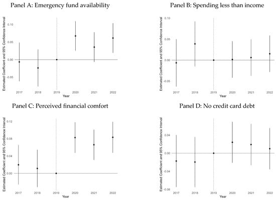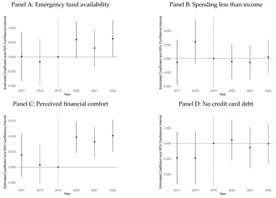 To investigate yearly variations in the relationship between financial literacy and FWB indicators, I estimate the event study specification shown in Equation (2). The coefficient of interest is , which estimates the changes in the gaps in FWB indicators between respondents with higher and lower financial literacy in different years (2017, 2018, 2020, 2021, and 2022) relative to 2019 (the reference year). A positive value of indicates that the gap between the two groups in year is greater than the gap in 2019, a negative value indicates that the gap is smaller, and a value of zero indicates that the gap is the same as in 2019. Figure 2 and Figure 3 show the point estimates and 95% confidence intervals of estimated with binary and alternative operationalizations of financial literacy, respectively. Each figure includes four panels (A–D) corresponding to the four FWB indicators. Table A5 and Table A6 in Appendix A show the coefficients of all the predictors in Equation (2) estimated with binary and alternative operationalizations of financial literacy, respectively.
