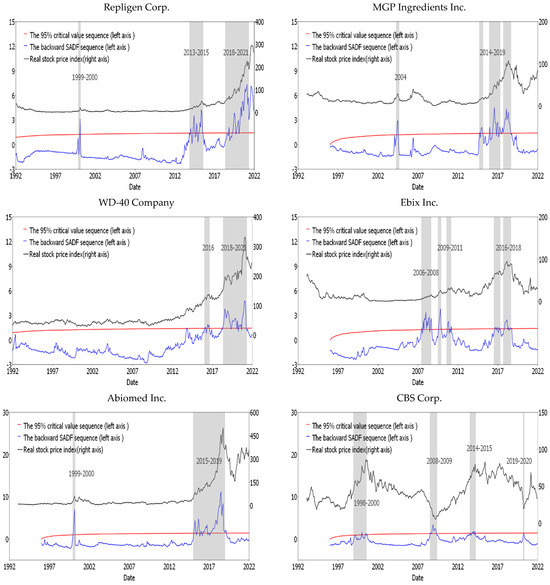 Figure 1 visually illustrates the time series for six individual firms with their date-stamping for real stock price index with lag order k = 1, showing their identified start and end of a bubble or crash. These examples illustrate the time series of firms’ real stock prices (drawn in black), the backward SADF sequence (drawn in blue) and the 95% critical value sequence (drawn in red) relative to each other. The backward SADF sequence and the 95% critical value sequence start 36 months later, from 1992. A bubble is denoted by the period (shaded in grey) where the blue line exceeds the red line. The duration of bubbles ranges from one year (2004 for MGP Ingredients Inc and 2016 for WD-40 Company) to five years (2015–2019 for Abiomed Inc., Danvers, MA, USA).