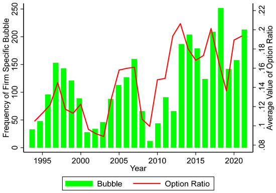 Figure 3 maps the frequency of bubble periods with option exercises and shows a positive correlation between option exercises and bubble periods. More specifically, it shows that when the frequency of firm- and year-specific bubble increases, the average proportion of options exercised also increases. However, this association is not monotonic.