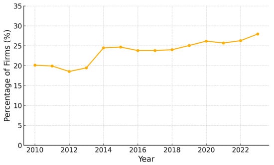 In this paper, the sample includes Chinese A-share-listed companies from 2010 to 2023. The sample period begins in 2010 to avoid the confounding effects of the Global Financial Crisis and to ensure the consistency and comparability of the financial data. We end the sample in 2023, the most recent year for which a complete set of annual reports and stock return data was available at the time of data collection. Figure 1 presents the proportion of firms using derivatives from 2010 to 2023. While the overall usage remains modest, a gradual upward trend is observed, particularly after 2014, reflecting the growing awareness and adoption of financial risk management tools among Chinese listed firms. Following Huang and Wang (2016) and F. Guo (2012), the paper restricts the sample to listed companies with risk exposure. For the types of risks to which firms are exposed, we consider the foreign exchange risk, interest rate risk, and commodity price risk, taking into account both previous research and the subject of this paper. In this paper, two criteria are used to determine whether a sample is exposed to foreign exchange risk. The first is the foreign currency translation difference. If the foreign currency translation difference in the sample’s balance sheet is not zero, the sample is considered to have had foreign exchange risk exposure that year. The second is the foreign business income. If the sample’s foreign business income is not zero, the sample is considered to have had foreign exchange risk exposure that year. If either of the two criteria is met, the sample could be included in the study. We use the industry level to determine the commodity price risk. First, we calculate the percentage of use of commodity derivatives in each industry. If the percentage exceeds 10%, that is, if more than 10% of the listed companies in the industry use commodity derivatives, then all other listed companies in the industry are considered to be exposed to commodity price risk. For the interest rate risk, if the firm uses interest rate derivatives during the year, it is determined to have had interest rate exposure. If the sample has at least one of these three risk types, the firm is considered to have had exposure.