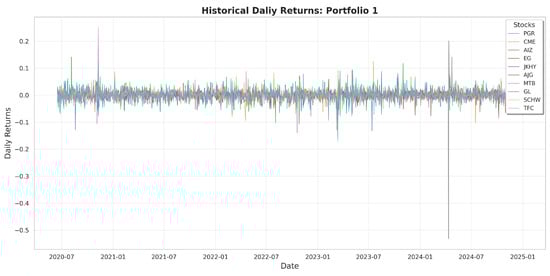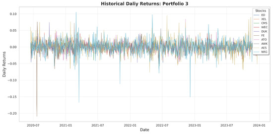 Asset selection criteria are based on sector diversification and the selection of the lowest beta (), demonstrating the explanatory power of multifactor models when the market risk is considered as a weighting factor in the same way as the other factors. The assets selected for each portfolio are shown in Table 2, Table 3 and Table 4, forming three portfolios of 10 assets each for the financial, energy, and utilities sectors, respectively. The daily returns of these assets, organized in portfolios, are shown in Figure 2, Figure 3 and Figure 4 for the period from 2020 to 2024.