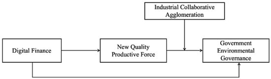 As a significant manifestation of regional economic integration, industrial collaborative agglomeration (ICA) is characterized by the concentrated spatial layout and mutual collaboration among different industries. This agglomeration phenomenon may positively affect the process by which new quality, productive forces promote government environmental governance. The factors of talent, capital, and information are more concentrated within industrial agglomeration areas, facilitating the formation of close and efficient industrial and supply chain relationships among enterprises and between enterprises and research institutions. This enables more rational allocation and utilization of resources, thereby helping to reduce resource waste and environmental pollution as well as improve the environmental governance efficiency. In addition, the scale benefits brought by industrial agglomeration facilitate frequent and efficient communication and cooperation among enterprises, which will encourage enterprises to increase production efficiency and lower costs for technological research and development. Specifically, enterprises can reserve sufficient funds and space for technological research and development innovation, production process innovation, and the improvement of end-of-pipe pollution control capabilities, accelerating green development transformation, and providing new approaches and means for government environmental governance. The following hypothesis is proposed accordingly, and the theoretical mechanism is illustrated in Figure 2.