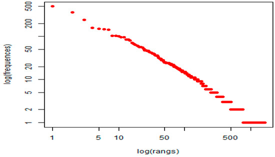 Figure 3 represents the Zipf diagram, which visualizes the frequency distribution of active forms or keywords within the corpus. The x-axis represents the keyword ranks based on frequency, whereas the y-axis shows the frequencies on a logarithmic scale. The downward slope of the plot indicates that a few keywords occur very often, whereas others are exceedingly rare. The long tail of the graph shows that many low-frequency keywords appear within the corpus, reflecting the texts’ linguistic diversity.