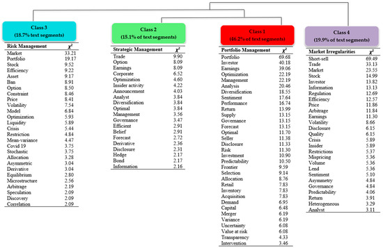 The branches of the dendrogram show the progressive division of the corpus. Starting from the initial primary division, each subsequent division splits the occurrences into a more specific, smaller classes until statistical stability is attained. This clustering process represents the broader concept of short-selling research, breaking down into more specific clusters of text segments within each class. The length of a branch between classes represents the degree of dissimilarity between those classes. As shown in Figure 4, Classes 1 and 2 are less dissimilar, whereas Class 4 is most dissimilar from the other classes in our corpus.