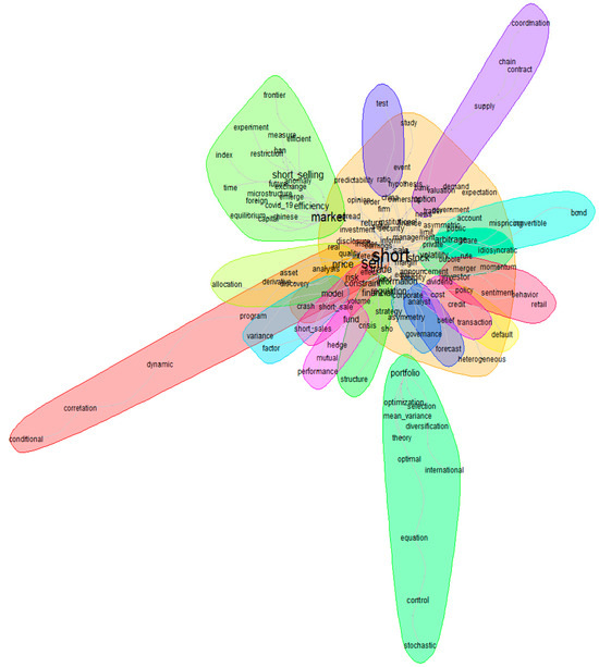 In addition, we performed a similarity analysis (see Figure 5) to identify the major topics covered in the corpus of short-selling literature. Closer terms in the figure represent frequently associated words, which reflects a conceptual linkage between them. The thickness and shortness of the lines indicate the connection strength between words based on their co-occurrence. The blobs or different colored groups of concepts are the semantic communities formed of strongly interconnected words. While this similarity analysis indicates that many distinct conceptual groups appear strongly connected with relatively short lines connecting them, there are a few groups of active forms or keywords that are less integrated with the rest of the short-selling literature.