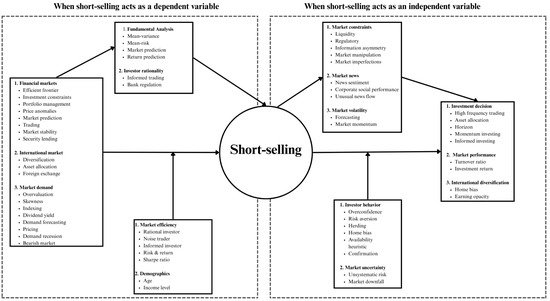 The second segment of our conceptual framework summarizes the literature in which short-selling has been considered an influencing factor on various outcomes. The impact of short-selling on investment decisions has investigated changes in asset allocation, informed decision-making, and other factors. The performance matrix of portfolios and overall investment returns have also been shown to be important aspects affected by short-selling. Additionally, global portfolio choices in terms of earning opacity and home bias have been shown to be influenced by short-selling. These relationships have been shown to be mediated by market constraints, such as liquidity and market manipulation. Simultaneously, market news has been found to mediate short-selling’s impact on market outcomes.
