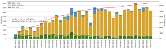 The dataset provided by the FinTech company encompasses 37 regular trading windows spanning from December 2022 to June 2024 (see Figure 1). It comprises a total of 26,884 offers and 4898 matched trades on the secondary market, culminating in a trading volume of EUR 454,330 across 308 distinct assets. Throughout the entire sample period, the platform registered 1365 individual users that bought and/or sold at least one share of an asset on the secondary market. The empirical data shows that the number of users is relatively stable over the trading windows, while the total user base of the platform grew continuously over time. Furthermore, the large majority of the sell offers in the offer book is entered during the pre-trading phase.