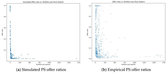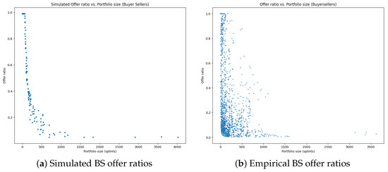 The resulting is clipped at the level to ensure that the agents have valid offer ratios. Hence, Buyer Seller agents with a larger amount of assets are designed to trade a smaller fraction of their total portfolio. A comparison of the simulated and empirical Buyer Seller offer ratios is provided in Figure 3.