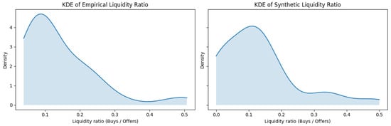 To visualize the shape of the two distributions more clearly, Figure 4 presents kernel density estimates (KDEs) for the empirical and simulated liquidity ratios. The plots show that both distributions are right-skewed and share a similar mode close to 0.1, yet the simulated synthetic data exhibit higher density in the lower tail. This supports earlier observations that the simulation slightly oversamples days with very low liquidity, a trade-off we accept to preserve model tractability.