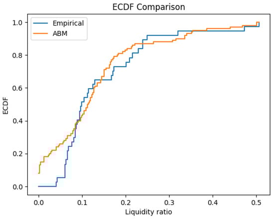 The simulations yield an average liquidity ratio of 12.8%, closely approximating the empirical average of approximately 14.5%, as shown in Table 3. Beyond this alignment in mean values, the model also replicates key distributional characteristics of the observed liquidity ratios. The simulated and empirical series are similar in terms of median, skewness, and kurtosis. The means differ by only 0.0152, and the medians by 0.0151. Furthermore, both series exhibit positive skewness and excess kurtosis (leptokurtosis), reflecting the heavy-tailed nature of liquidity shocks: the empirical data show a skew of 1.8 and excess kurtosis of 3.3, while the ABM yields a skew of 1.3 and excess kurtosis of 1.7. The similarity of these higher-order moments demonstrates that the model captures not only the central tendency but also the pronounced asymmetry and tail thickness observed in real-world liquidity distributions. Although discrepancies become more pronounced in the higher moments, this is acceptable given the focus of the study. Since the aim is to understand general liquidity dynamics rather than to model extreme events or outliers, we intentionally avoid overfitting or adding unnecessary complexity to address rare tail behaviors.