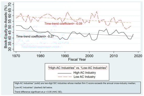 Secondly, () highlight that, over the past hundred years, the overall leverage of U.S. companies has surged more than threefold, largely due to a significant rise in debt financing among firms not subject to regulatory constraints. Similarly, () document that, from 1950 to 2008, more firms increased leverage than decreased it, indicating that firm capital structures have not been stable over time and suggesting a trend toward more aggressive borrowing. () finds that there was an increase in average book leverage over the postwar period for non-financial firms. Taken together, the empirical findings imply that the growing preference for debt over equity in corporate capital structures has naturally contributed to the observed long-term decline in book equity values.