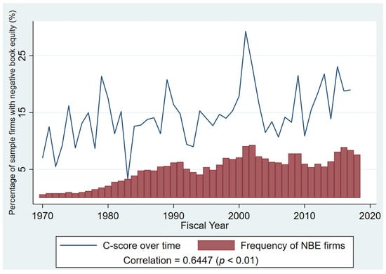Earlier research on book equity has identified a downward trend in book equity levels over time, alongside a growing prevalence of firms reporting negative book equity. In this paper, we argue that these empirical regularities may be explained by accounting conservatism. The previous section provides some theoretical rationales of how accounting conservatism may affect BE over time. In this section, we present some descriptive evidence that supports our motivation and show how BE and accounting conservatism vary over time. Following the approach of (), book equity (BE) is computed by summing shareholders’ equity, deferred taxes, and investment tax credits, and subtracting the book value of preferred stock. For consistency and comparability across firms, BE is standardized by total assets.