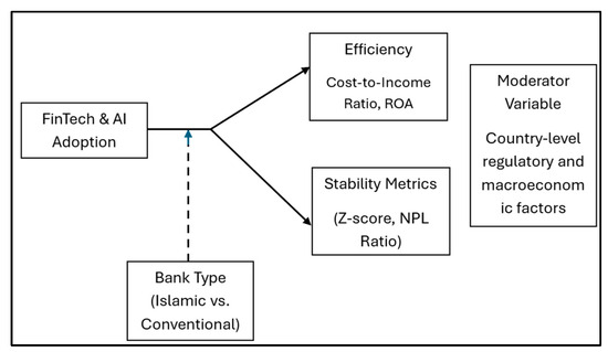 The conceptual framework (Figure 1) depicted above illustrates the hypothesized relationships within our study. FinTech adoption is positioned as the primary independent variable, influencing bank efficiency and stability. Bank type (Islamic Vs. conventional) is theorized to moderate these relationships, leading to differential impacts. Additionally, macroeconomic and bank-specific control variables are incorporated to isolate the unique effects of FinTech and bank type. This framework guides our empirical model specification and interpretation of the results.
