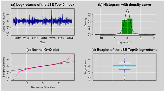 (a) Log-returns for JSE Top40 stock index, (b) histogram with density curve plot of daily log-returns, (c) normal Q–Q plot of daily log-returns, and (d) boxplot of the JSE Top40 log-returns.