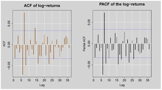 ACF and PACF plots of the standardised JSE Top40 log-returns.