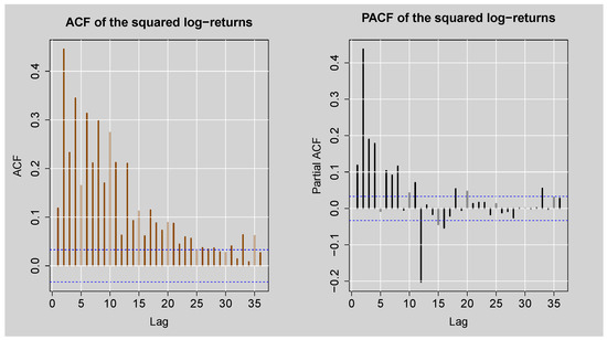 ACF and PACF plots of the squared standardised JSE Top40 log-returns.