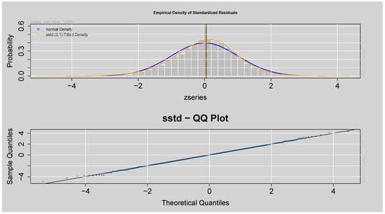 Q-Q and Empirical Density plots of the Standardised Residuals from ARMA(3,2)-EGARCH(1,1) model.
