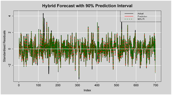 Forecast of Standardised Residuals with 90% Prediction Intervals from the ARMA(3,2)-EGARCH(1,1)-XGBoost Model.