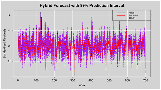 Forecast of Standardised Residuals with 99% Prediction Intervals from the ARMA(3,2)-EGARCH(1,1)-XGBoost Model.