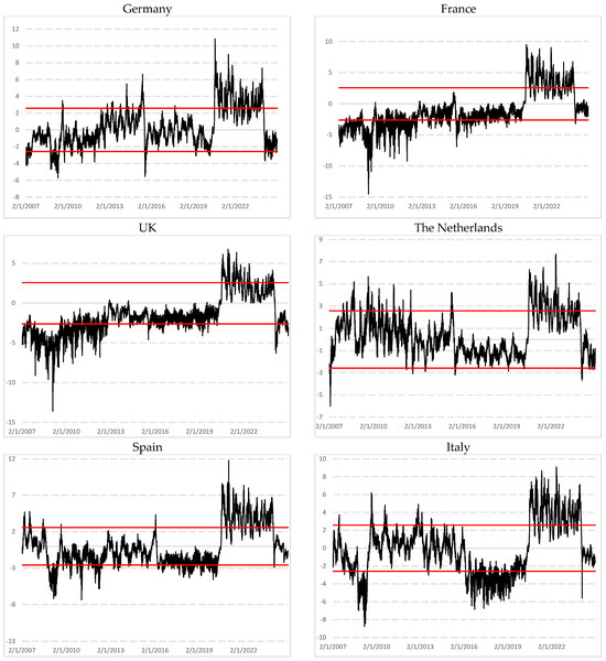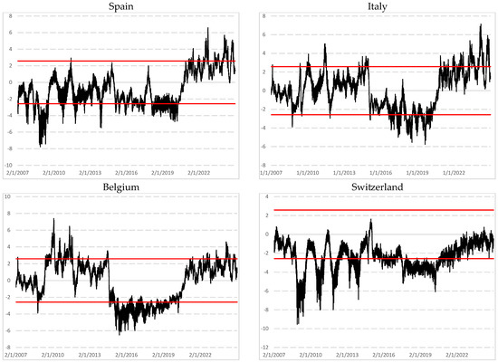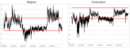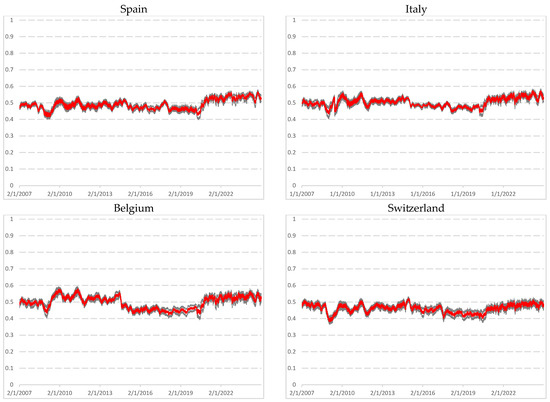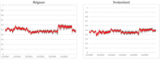 Figure A1 in Appendix B depicts the rolling kurtosis values computed using overlapping window of 1000 and 1500 observations. Few studies have examined the dynamic evolution of kurtosis over time. In the figure, black and grey lines represent estimates for window sizes of 1000 and 1500 observations, respectively. The results reveal similar patterns across markets, with higher kurtosis values clustering during periods of financial turmoil. In particular, kurtosis spiked significantly during the subprime mortgage crisis and the COVID-19 pandemic, reaching values of 30 to 35 for France, Germany, the UK, and the Netherlands; and exceeding 45 for Italy, Spain, and Belgium. Switzerland exhibited more stability, with kurtosis remaining below 25 during the pandemic when using a 1000-day window. During the subprime mortgage crisis, kurtosis peaks were generally lower, ranging between 15 and 20. These spikes are more pronounced with a 1000-day window than with a 1500-day window, indicating that longer windows smooth extreme returns and volatility. The 1000-observation curve shows sharper and more reactive peaks, particularly in early 2009 and early 2020, whereas the 1500-observation curve produces a smoother profile, mitigating the impact of extreme values.