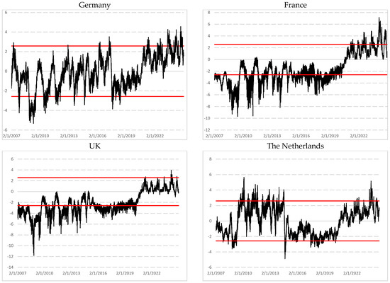 The Dutch market continues to fluctuate mostly within the confidence interval but shows additional episodes of mean-reversion in 2008, as well as long-range dependence from 2009 to 2013 and again around 2022. The Spanish market similarly exhibits mean-reversion before 2016 and persistence after 2020, but these transitions are more gradual.