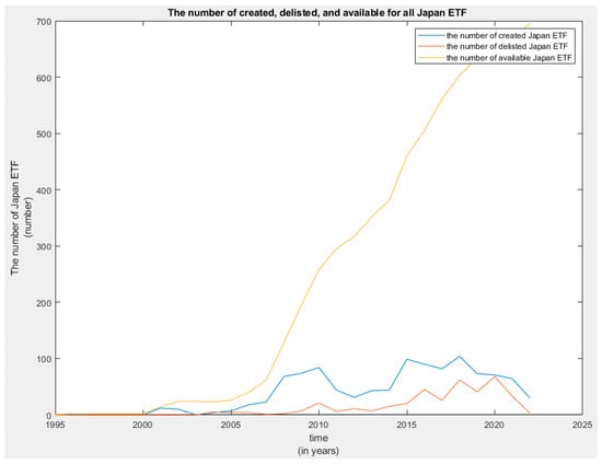 Figure 1 shows the annual number of JETFs created, delisted, and available globally. Notably, the number of tradable JETFs increased substantially after 2007, reflecting the rapid expansion of the ETF market. However, both the creation and delisting of JETFs appear to decline after 2020, possibly indicating a market saturation effect or a shift in investor preferences. To better visualize these developments, Figure 1 presents the annual time series for each category.