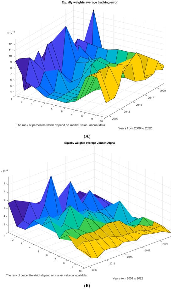 Figure 2B shows value-weighted tracking errors (TE(1)) based on firm levels from the 10th percentile to the 90th percentile based on JETF market value. We firstly calculate the average daily Jensen’s alpha (risk-adjusted returns) for each JETF from 1 January 2008 to 30 April 2022. Then, we divide our 1077 JETF samples into the 10th, 20th, 30th, 40th, 50th, 60th, 70th, 80th, and 90th percentile based on their market value. For example, 10th percentile means the JETFs whose market values are the lowest 10 percentage and the rank is 1. This figure describes equally weighted tracking errors from different percentile ranks. All data is winsorized at the 5-percent level. Figure 2B indicates that as the size of JETFs increases, the risk-adjusted return (measured by Jensen’s alpha) generally declines, suggesting that larger JETFs tend to offer lower returns to investors. This pattern is consistent with the characteristics of derivative investment products that are linked to equity-based, risky assets.