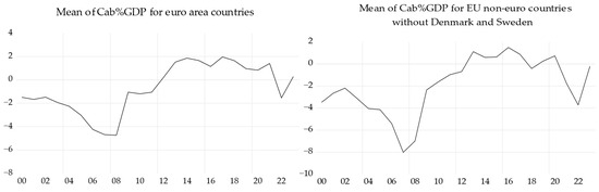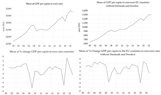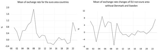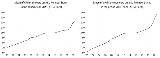 The second sub-period, 2009–2023, shows a similar evolution of the average inflation rates for both groups, but with higher values for non-euro economies. The impact of the 2008 economic crisis produced a deeper CPI decrease in 2009 for the euro area than for non-euro area countries. The inflation rate in 2020 was close to 0 for the euro area, while it was around 2% in non-euro EU countries. Russia’s war against Ukraine, which began in 2022, led to a major change in the CPI of around 10% for the Eurozone and over 12% for non-euro countries.