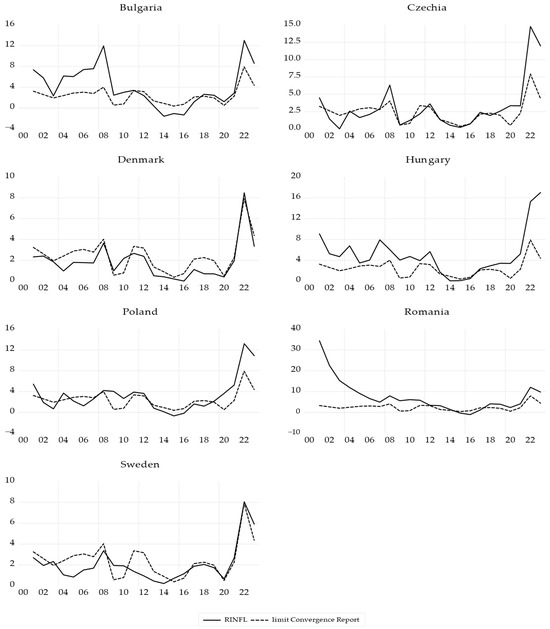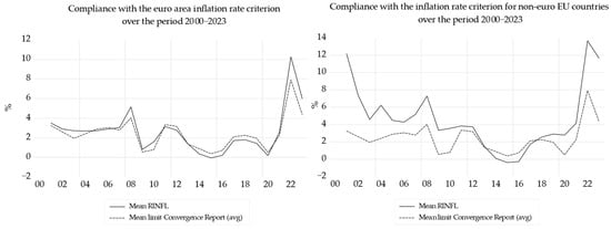 For EU countries outside the euro area, the average inflation rate was below the upper permissible limit only in the years 2013–2017; above the reference value of 1.8% in 2020, and much more in 2022 and 2023. The inflation rate (RINFL) was calculated based on fixed-base CPIs in 2015. The summary data on the inflation rate to be taken into account for the price stability criterion are presented in Table 1, for both the euro area and the non-euro area.