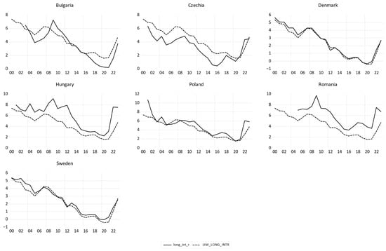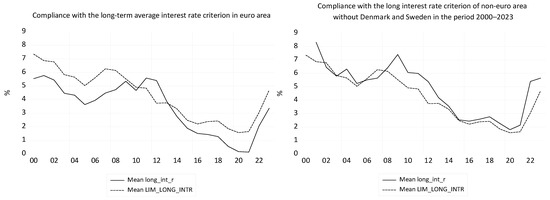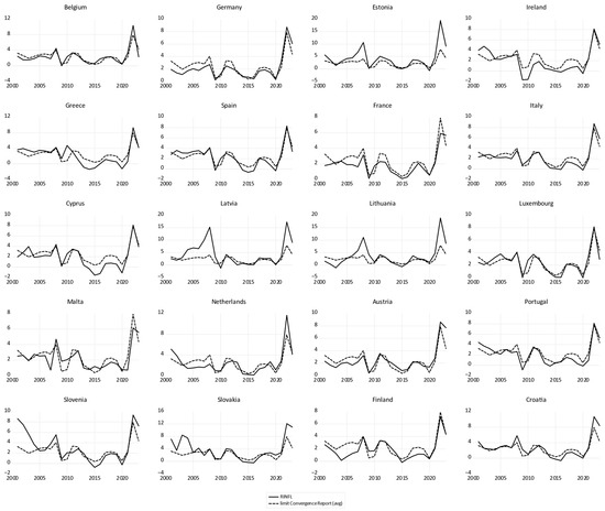 In Figure 2, the average inflation rate (RINFL) in the euro area countries exceeds the admissible limit of the convergence criterion on price stability in the years 2007–2010 and 2021–2023; the major causes of the price increase are the economic crisis in 2008 and after the COVID-19 pandemic in 2020, and the Russian–Ukrainian war in 2022. The 1.8% inflation reference value set by the 2020 Convergence Report was met only in that year. The 2022 Convergence Report increased the inflation benchmark to 4.9%, but it was underestimated because the Russian war that began in February 2022 triggered price increases.