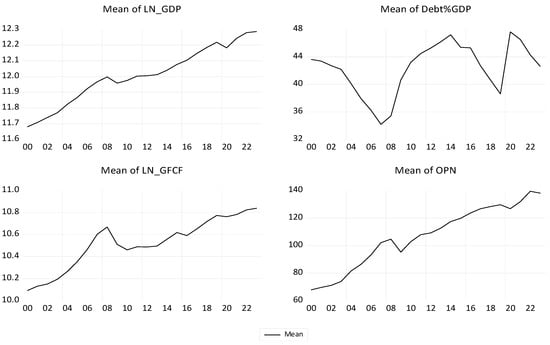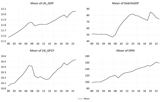 Correlation analysis, Granger causality analysis, and panel cointegration tests suggested the following explanatory variables (xit, with i—country and t—year): investment dynamics through LN_GFCF, the debt-to-GDP ratio, called DEBT_GDP, and the international openness, OPN, as the ratio between the sum of imports and exports and GDP.