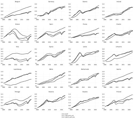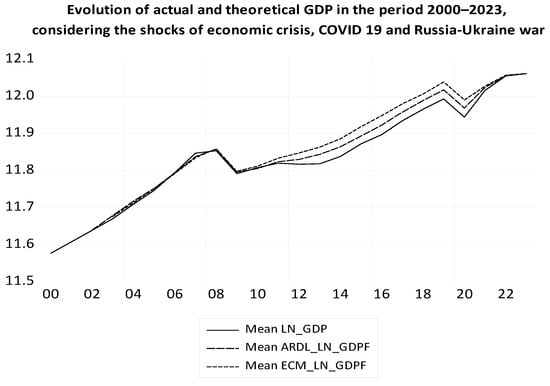 To compare the behavior of each group of countries to economic shocks, we also build econometric models with the corresponding dummy variables. For both approaches, based on appropriate dummy variables, we consider the effects of the 2008 economic crisis (c2008), the effects of COVID-19 in 2020 (covid), and the Russian–Ukrainian war (war). For the effects of the 2008 economic crisis on economic growth, the dummy variable c2008 is 1 for the year 2009, and 0 otherwise. The dummy variable covid is 1 for year 2020, and the variable war—for year 2023. The differences between the coefficients of the dummy variables of economic shocks highlight how they affected economic growth, representing the economic responses of each country and the groups analyzed.