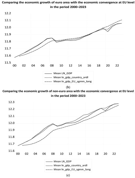 The two groups of EU economies, the euro area and the non-euro area, are statistically analyzed taking into account the fulfillment of the euro area financial criteria and economic performance over the period 2000–2023. Compliance with financial criteria, economic performance, and their significant influencing factors are presented comparatively for the two groups of countries. The long-run equilibrium between economic growth and its factors is identified by econometric approaches with the error correction model (ECM) and autoregressive distributed lag (ARDL) models for the two data panels. In the short term, economic shocks are taken into account to compare their different influences on economic growth within the two groups of countries. The GMM system is used to model economic convergence at the EU level over the period under review. Comparisons between GDP growth and its theoretical values from econometric models have led to interesting conclusions regarding the existence and characteristics of economic convergence at the group and EU level. EU countries outside the euro area have higher economic growth rates than euro area economies over the period 2000–2023. In the long run, investment brings a higher increase in economic development in EU countries outside the euro area than in euro area countries. Economic shocks have been felt more deeply on economic growth in the euro area than in the non-euro area. The speed of adjustment towards long-run equilibrium in econometric models is slower for non-euro area economies than in the euro area over a one-year period. At the level of the European Monetary Union, change policies have a faster impact on economic development and a faster speed of adjustment towards equilibrium.