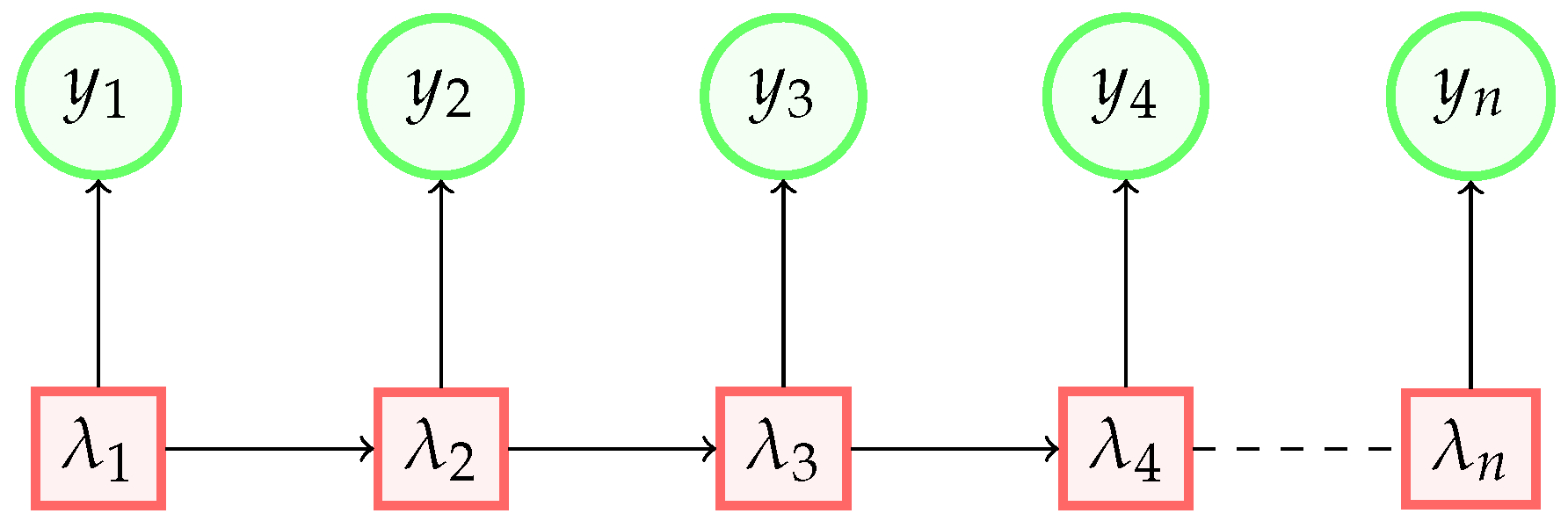 - E-step: Compute the expected complete log-likelihood , given current parameter values. This involves evaluating the posterior change-point probability and the distribution of intensity using forward–backward filtering (See Appendix A).As the prior distribution is a Gamma distribution, which is a conjugate prior for the exponential distribution, the posterior distribution of is also a Gamma distribution. Hence, the posterior distribution of intensity is as follows: