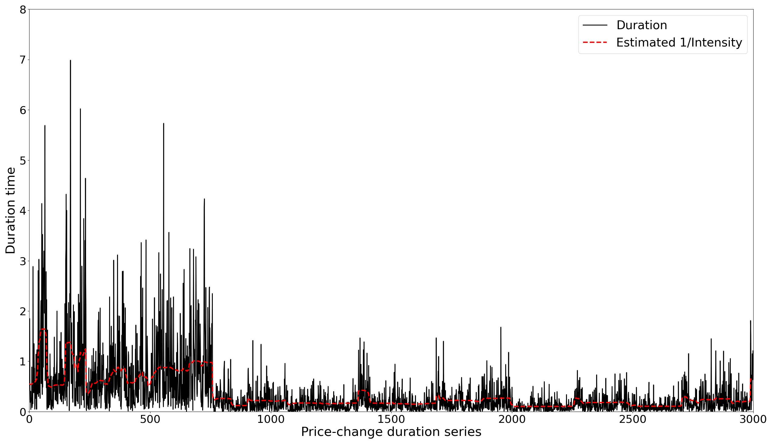 - Engle, R. F., & Russell, J. R. (1998). Autoregressive conditional duration: A new model for irregularly spaced transaction data. Econometrica, 66(5), 1127–1162. [Google Scholar] [CrossRef]