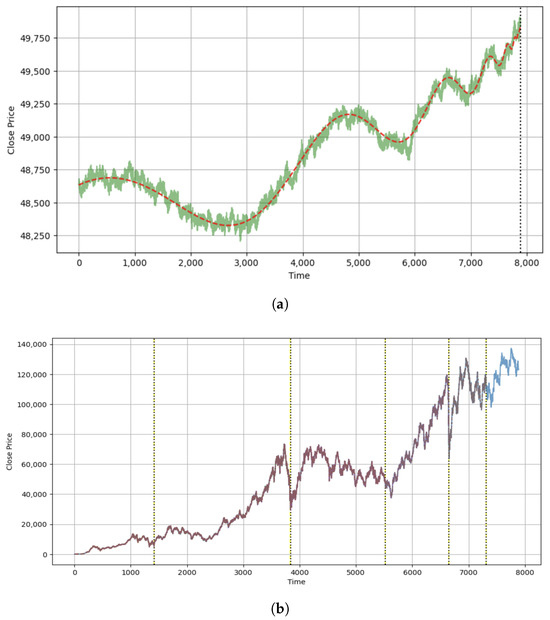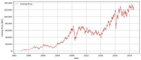 For this research, a dataset was collected comprising daily observations of the Bovespa index, spanning from 27 April 1993 to 6 March 2025. Based on public availability, the historical data was downloaded from Yahoo Finance for the above-mentioned dates. The dataset contains a total of 7889 entries, including various indicators such as Date, Open, Close, High, Low, and Volume traded. Table 2 provides the first and last five rows of the dataset used for the research work. Non-trading days, including weekends and official public holidays, were naturally excluded from the dataset as no market activity occurs on these days.