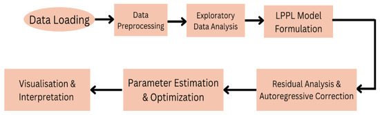 The methodology of this research follows a quantitative approach under a nonlinear stochastic framework to assess the applicability of the LPPL model in modeling financial crashes in the Brazilian stock market. The application of LPPL in emerging markets builds on earlier empirical studies that have tested the model in emerging-market contexts. Prior work has shown that LPPL structures can be identified in Indian stock market crashes (Sarda et al., 2014, 2010), as well as in the South African market during the 2003–2006 speculative bubble (Zhou & Sornette, 2009). More recently, Ghosh et al. (2021) provided evidence that the LPPL framework captures the nonlinear dynamics of financial bubbles in an emerging-market setting. On the other hand, only a few studies, such as Sarda et al. (2019), suggest that LPPL is not applicable in contexts like the Indian realty market. Therefore, the LPPL model can offer meaningful explanatory and predictive insights in markets that share structural similarities with Brazil, thereby supporting its adoption for the present analysis. The primary goal is to identify and understand pre-crash dynamics through data-driven modeling and time series analysis. Although Brée et al. (2013) states that time series modeling is inherently complex, its application is essential in studying speculative bubbles and anticipating market downturns. The study uses Python-3.12 as the primary computational tool and programming framework, integrating libraries such as Pandas and NumPy for data handling, Matplotlib-3.8.4 and Seaborn-0.13.2 for visualization, SciPy-1.13.1 for optimization, and Statsmodels for time series analysis. The first step involves data preprocessing, where missing values are handled, and time formats are standardized. A logarithmic transformation is applied to normalize price distributions: