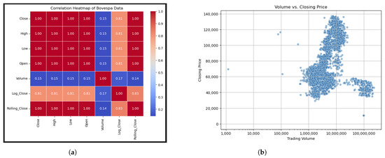 Correlation heatmap and scatter plot illustrating relationships between variables and feature selection. (a) Heatmap. (b) Volume over closing price.