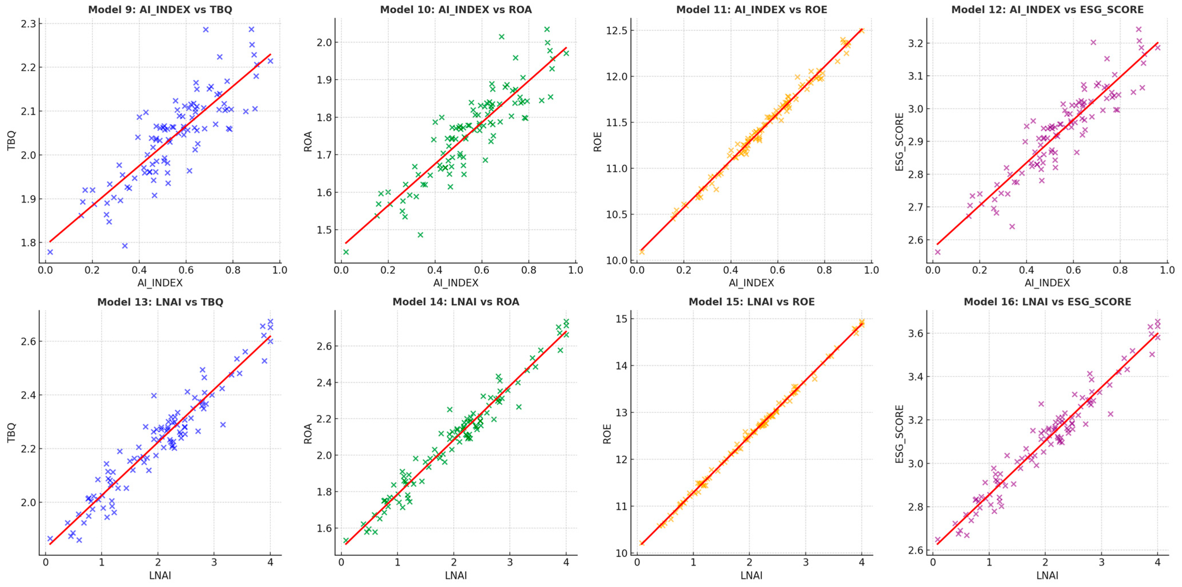 Figure 1 presents scatter plots illustrating the relationships between the intensity of AI-related investment (AI_I and its logarithmic form, LNAI) and firm-level performance indicators (TBQ, ROA, ROE) as well as ESG SCORE. The fitted red lines indicate positive slopes across all models, visually confirming the positive associations reported in the GMM regression results. These plots show that firms with higher levels of AI-related capital tend to exhibit improved market valuation, profitability, and ESG performance, supporting the hypothesis that AI adoption enhances both financial and sustainability outcomes.
