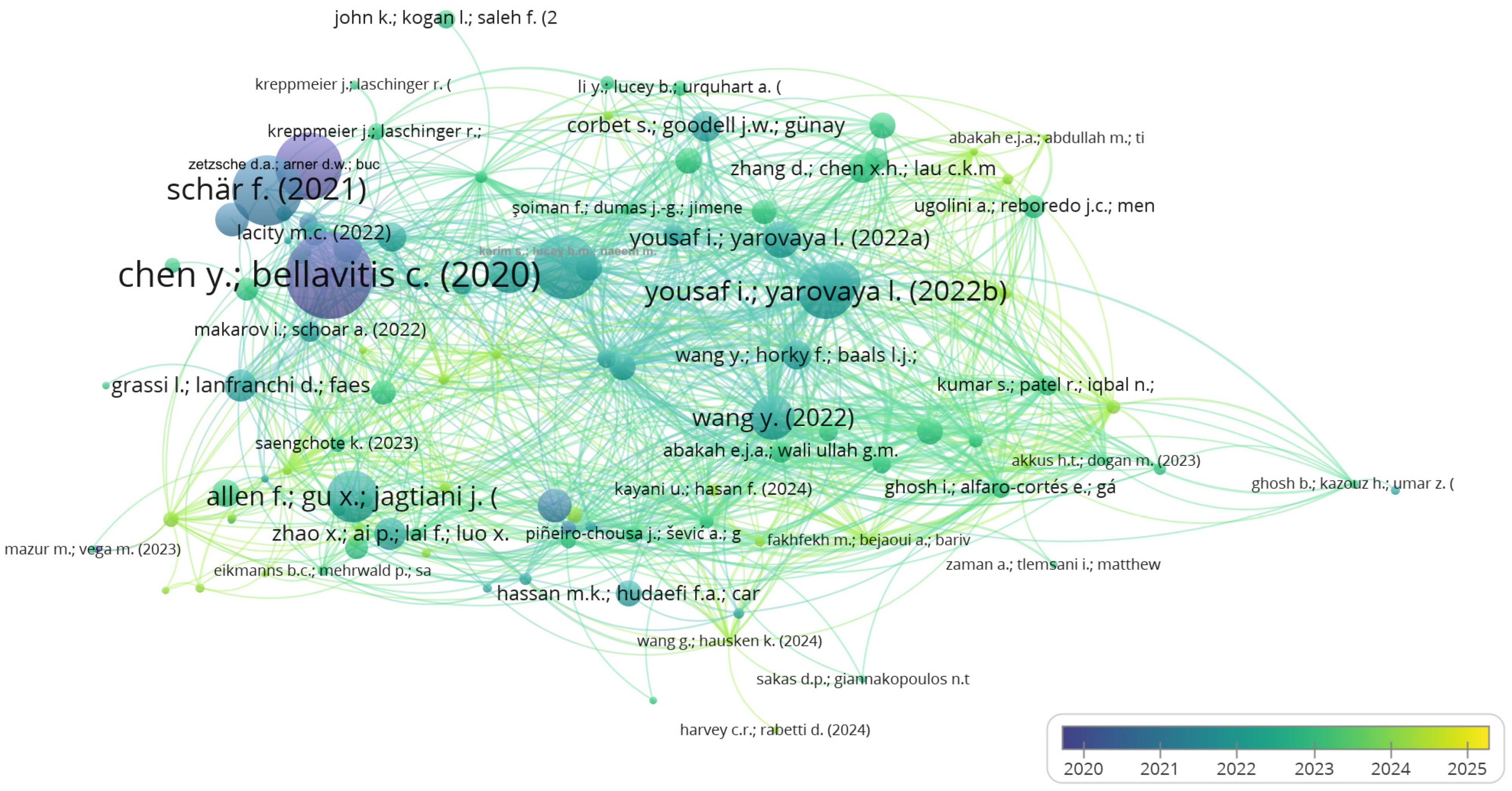 - Cluster IV (yellow) is titled “Cryptocurrency dynamics and integration in financial ecosystems” and consists of 16 articles. The main theme of these papers is speculative risks, regulatory challenges, and financial inclusion, while investigating market interactions (through traditional and digital assets as well as investor sentiment), environmental impacts, and emerging financial technologies.